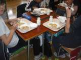 今日の給食は、そぼろごはん、やきししゃも、みそしるでした。グループで楽しい話題に...