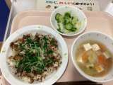 献立 マーボー豆腐丼 にら玉スープ リンゴゼリー 牛乳 明...