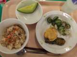献立 かつお混ぜご飯 じゃが芋の天ぷら ちくわの磯辺揚げ やさいのゆかりかけ く...