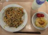 献立 塩焼そば じゃがまるチーズ ミニトマト 牛乳 豚肉、にんにく(青森) し...