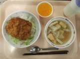 献立 ソースかつ丼 具だくさん汁 みかんゼリー 牛乳 米(秋田) 豚肉(青森)...