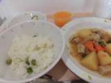 献立 グリーンピースごはん 新じゃがのそぼろ煮 かぶのレモン醤油 キャロッ...