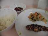 献立 ごはん 鮭の南部焼き 野菜のからし醤油 煮豆(うずら豆) 牛乳 米...