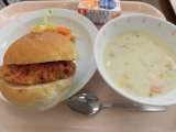 献立 フィッシュバーガー キャベツサラダ クリームシチュー オレンジュース...