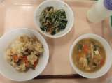 献立 中華混ぜご飯 マーボー汁 塩ナムル 牛乳 豚肉(青森) 米(秋田) もち...