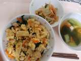 献立 親子丼 豆腐と青菜のスープ こんにゃくサラダ 牛乳 ...