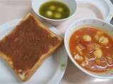 献立 きな粉バタートースト ミネストローネ 抹茶しらたま 牛乳...