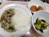 献立 ガパオ丼 ピリカラ胡瓜 豆腐入り手作り白玉(きなこ) 牛...