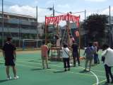 何とか雨も上がり、林工務所の方々のご協力で櫓を立てています。お祭り委員さんを中心...