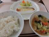 献立 ごはん 鮭のチーズ焼き キャベツサラダ 具だくさん味噌汁 牛乳 米...
