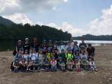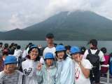 湯の湖で集合写真を撮りました。 硫黄の匂いに反応しています。