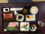朝食の様子です。メニューは「ご飯、なめこ汁、焼き鮭、ハムサラダ、オムレツ、ツルム...