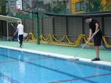 プールサイドに、日よけを設置しました。少しでも日陰ができて、強い日差しを直接浴...