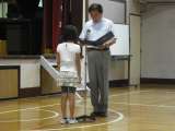 今日の朝会では、6年生の代表の走りを見本に、近づいている運動会の短距離走で速く走...