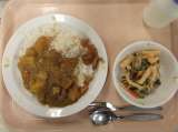 献立 カレーライス 福神漬け 油揚げのサラダ 牛乳 にんにく、豚肉(青森) 生...