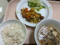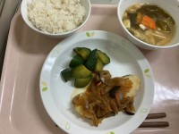 献立 むぎごはん 豚肉と大豆の揚げ煮 ひとしお野菜 サンラータン 牛乳 まだまだ...