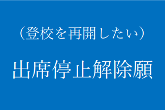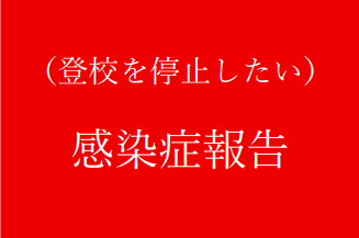 1. 下の赤いボタンをタップして、「感染症報告」を入力・送信してください。 2.「すぐーる」に欠席連絡を入力してください。 ※感染症の詳細については「感染症報告」でお知らせ頂いているので、「すぐーる」に入力する情報は病名のみで構いません。 3.登校再開時、前日の16時30分までに、 下の青いボタンをタップして、「出席停止解除願」を入力・送信してください。