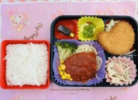 今日の献立(12月2日)・ご飯・ハンバーグトマトソース・エビミックスフライ・れんこんとごぼうのごまサラダ・付け合わせ(ブロッコリー・コーン)・うぐいす豆煮・スパゲッティ・千切りキャベツ※本日のお弁当注...