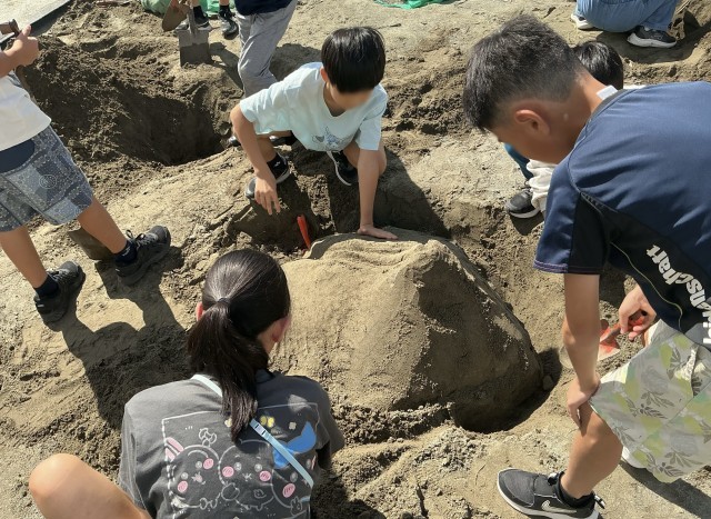 川の流れによる侵食の様子を、実際に砂山を使って観察しています。