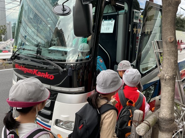 初めてバスに乗って移動する行事に緊張している様子ですが、しっかりと学習してきます。