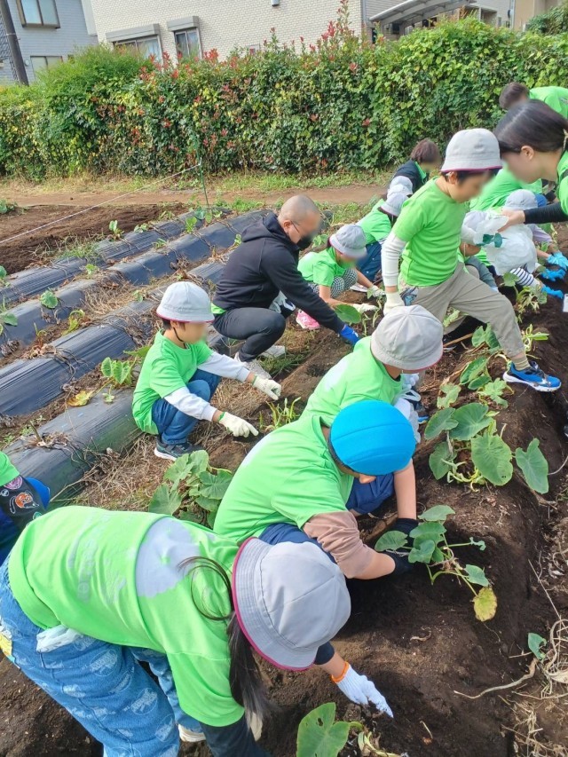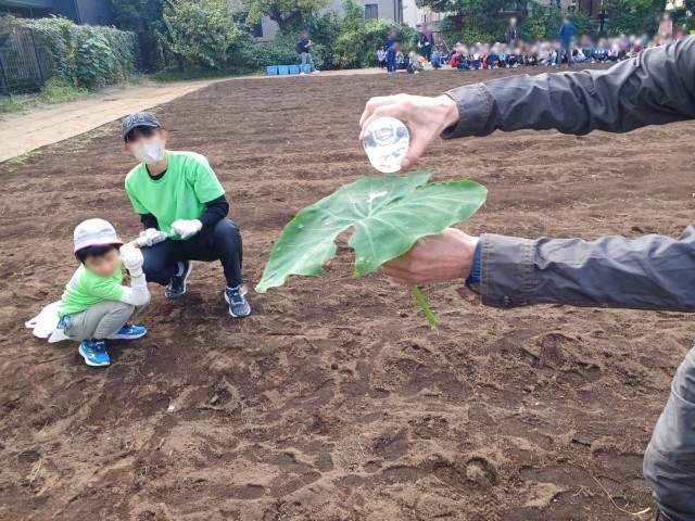 里芋の葉っぱは水を弾くことを知り、驚いた様子でした。その後里芋の収穫をしています。