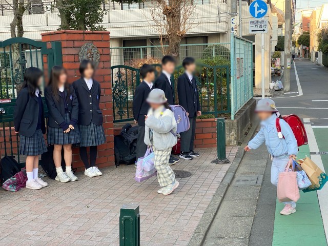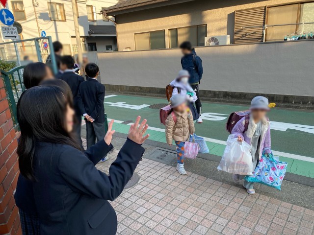 尾山台中学校の生徒と一緒にあいさつ運動を行いました。