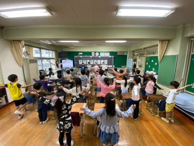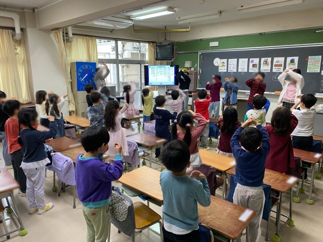 モジュールの時間を利用して、6年生が1年生に「ありがとうの花」の歌い方や振り付けを教えています。