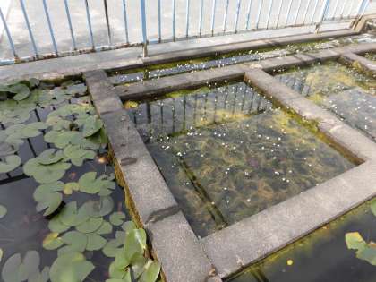 ヘチマやゴーヤが日々成長しています。観察池の植物の様子も少しずつ変わり、メダカも増えてきました。