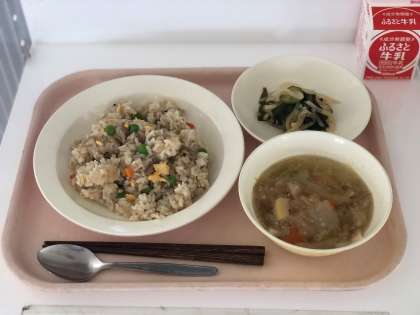 今日の給食は、チャーハン、大根サラダ、中華スープ、牛乳です。
