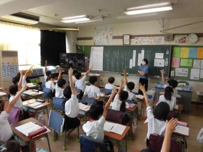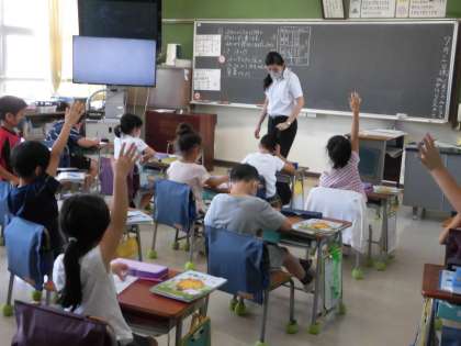4年生の国語「つなぎ言葉のはたらきを知ろう」、2年生の算数「たし算」の学習の様子です。どちらのクラスも自分の意見を積極的に発言していました。今日はとても暑い一日でしたが、子どもたちは水分を適宜とりながら生活できました。
