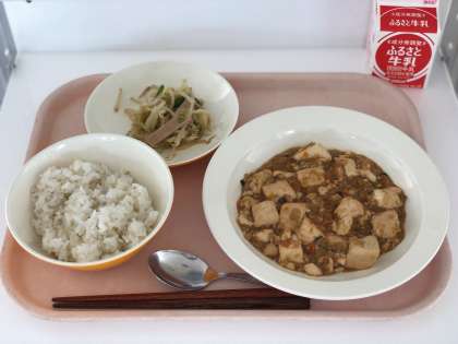 今日の給食は、ごはん、麻婆豆腐、中華サラダ、牛乳です。