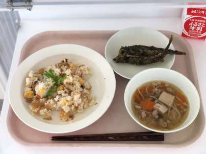 今日の給食は、ちらしずし、ししゃもの磯辺あげ、七夕汁、牛乳です。