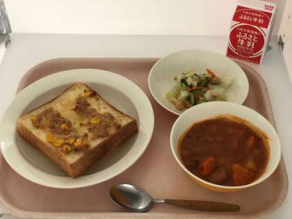 今日の給食は、ツナコーントースト、トマトシチュー、ビーンズサラダです。