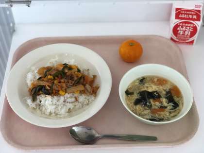 今日の給食は、夏野菜の豚キムチ丼、わかめとたまごのスープ、冷凍みかん、牛乳です。