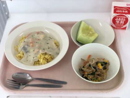 今日の給食は、ドリア風、青菜とベーコンのサラダ、メロン、牛乳です。