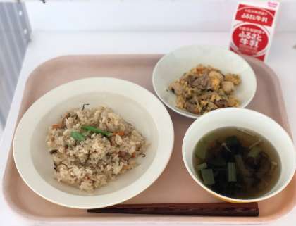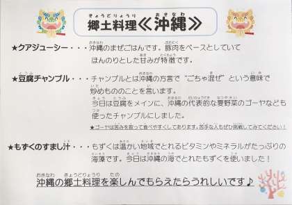 今日の給食は、クアジューシー、豆腐チャンプル、もずくのすまし汁、牛乳です。