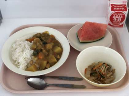 今日の給食は、夏野菜カレーライス、こんにゃくサラダ、くだもの(すいか)、牛乳です。