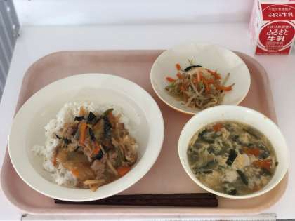 今日の給食は、スタミナ丼、ナムル、にらたまスープ、牛乳です。