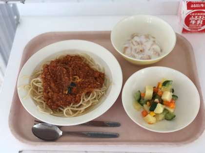 今日の給食は、なす入りみそミートソーススパゲッティ、マセドアンサラダ、ピーチヨーグルト、牛乳です。