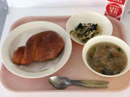 今日の給食は、あげパン(シナモン)、春雨スープ、大根サラダ、牛乳です。