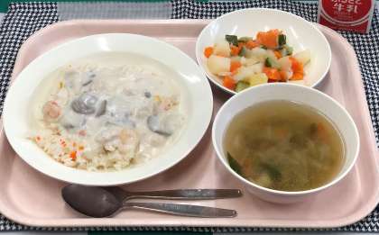 今日の給食は、ピラフのクリームソースかけ、コロコロサラダ、野菜スープ、牛乳です。