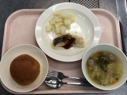 今日の給食は、米粉パン、魚のステーキソースかけ、粉ふきいも、コンソメスープ、牛乳です。