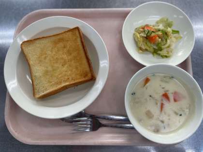 今日の給食は、ハニートースト、クラムチャウダー、ビーンズサラダ、牛乳です。