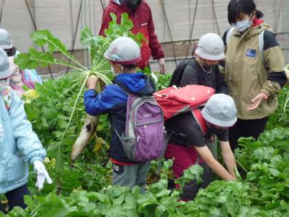 玉堤にある高橋さんの畑で大根抜きを体験しました。想像以上に大きくて立派な大根を収穫することができ、子どもたちは大喜びでした。