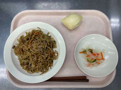 今日の給食は、ソース焼きそば、大根の甘酢かけ、甘納豆蒸しパン、牛乳です。