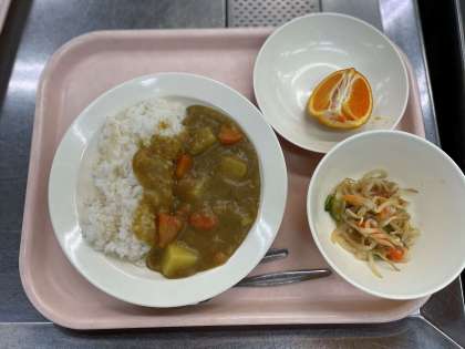 今日の給食は、シーフードカレーライス、こんにゃくサラダ、くだもの(早香)、牛乳です。