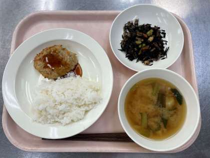今日の給食は、ごはん、れんこんのつくね焼き、ひじきの煮付け、みそ汁、牛乳です。