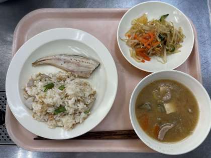 今日の給食は、里芋ごはん、ほっけの塩焼き、糸寒天と野菜の和え物、粕汁、牛乳です。