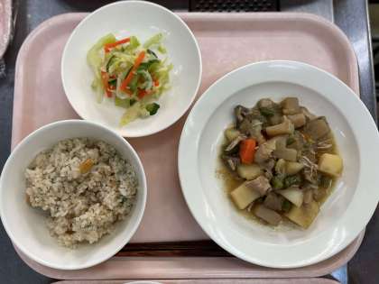 今日の給食は、大豆と青のりのごはん、筑前煮、野菜のレモンしょうゆかけ、牛乳です。