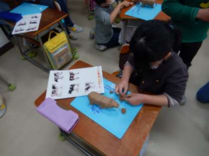 3学期初の図工の学習では、ねん土で今年の干支である「牛」をつくりました。